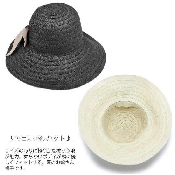 柔らかいボディが頭に優しくフィットする、夏のお嬢さん帽子です。顔全体や首に影を作ってくれるのに十分なつばの長さで、つばを上げたりすると視界も良好☆しなやかに広がる大きなリボンはつば広ハットの大きさをごまかしてくれる可愛いアクセント!サイズのわりに軽やかな被り心地が魅力です♪