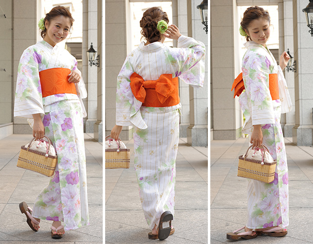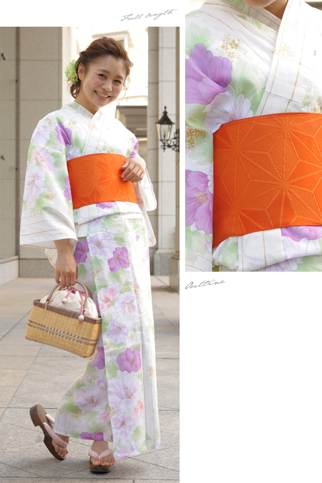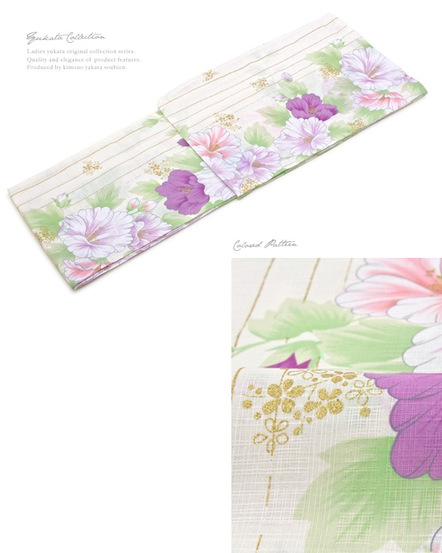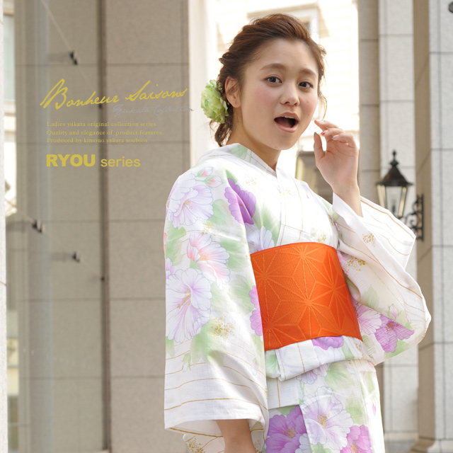 浴衣セット レディース レトロ 浴衣セット 大人 3点セット 白 ホワイト 紫 オレンジ 芙蓉 花 縞 ラメ 綿 半幅帯 女性 ボヌールセゾン フリー