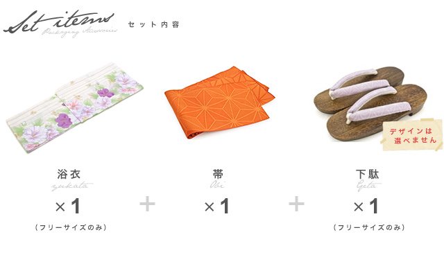 こちらの商品は、浴衣・帯・下駄の3点セットです。セット内容の一部変更や、それに伴う値引きは承っておりません。