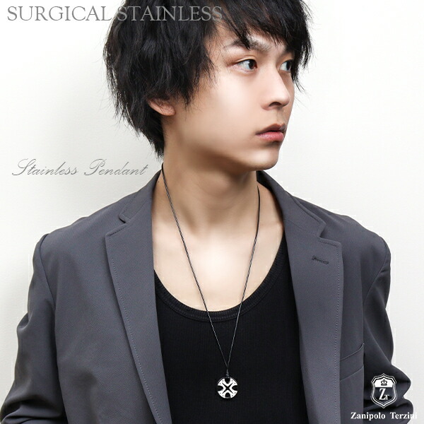 円盤型のペンダントトップにアイアンクロス型のパーツを組み合わせた、サージカルステンレス製ネックレスです。