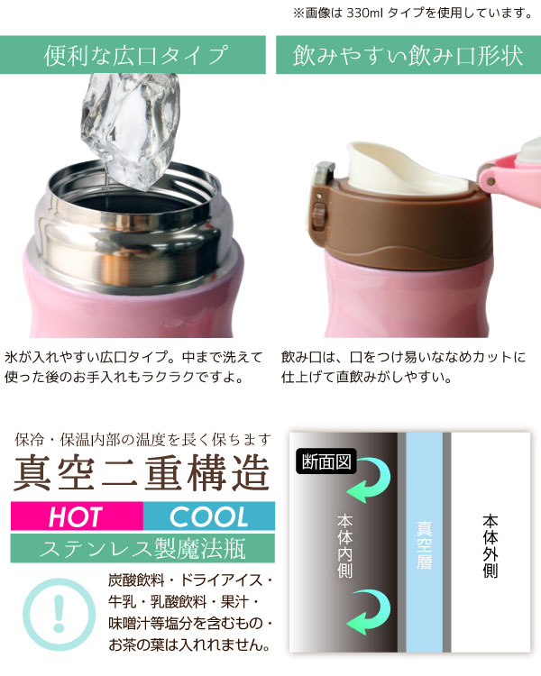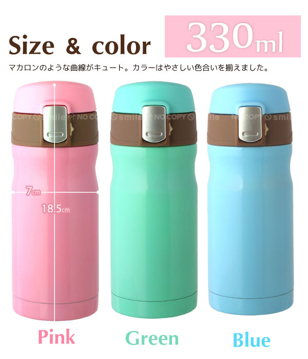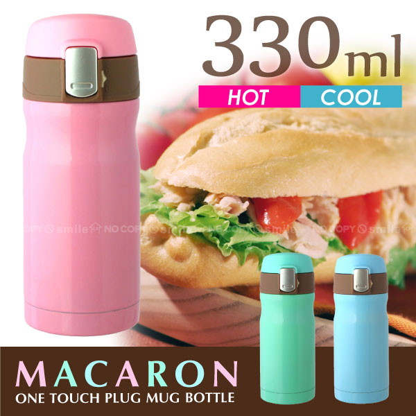 マカロンのようなころんとした形状がかわいらしいMACARON330mlタイプです。約7cmの直径のスリムボディでバッグにもサッと入るステンレスボトルです。つまみを上げて中央のボタンを押すだけですぐ直飲みできるワンタッチ栓タイプ。!広口タイプで氷も入れやすく、お手入れも楽々!保温・保冷対応。真空二重構造で内部の温度をより長く保ってくれます。