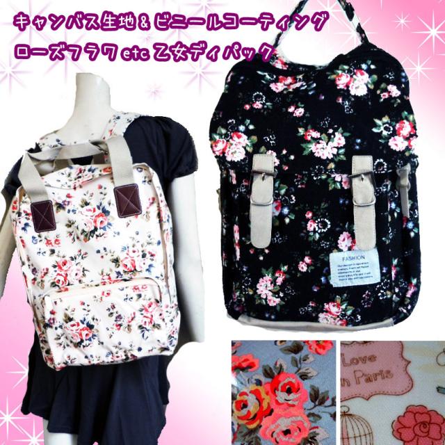 訳あり 送料無料 リュック おしゃれ キャンバス生地 ビニールコーティング ローズ フラワー 乙女 ディパック 薔薇 パリジェンヌ 水玉 ドット かわいい リュックサック ヴィレバン パステル 配達日時指定不可