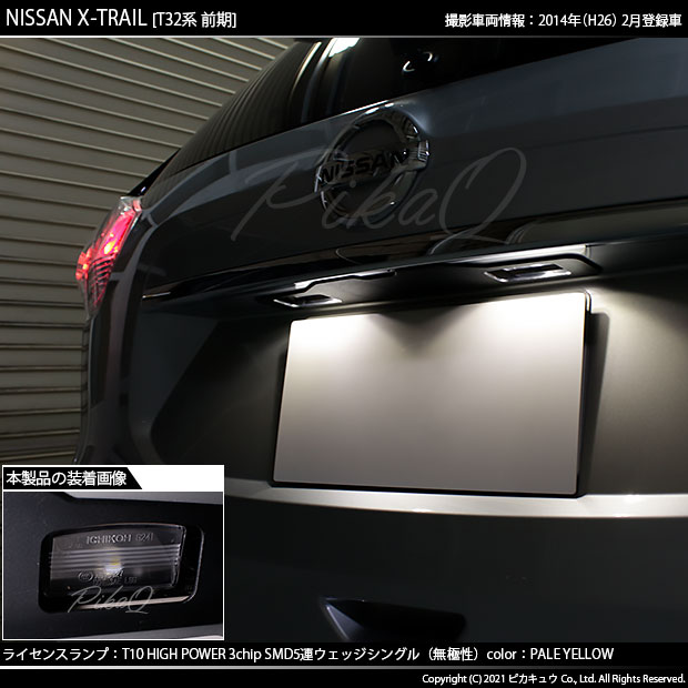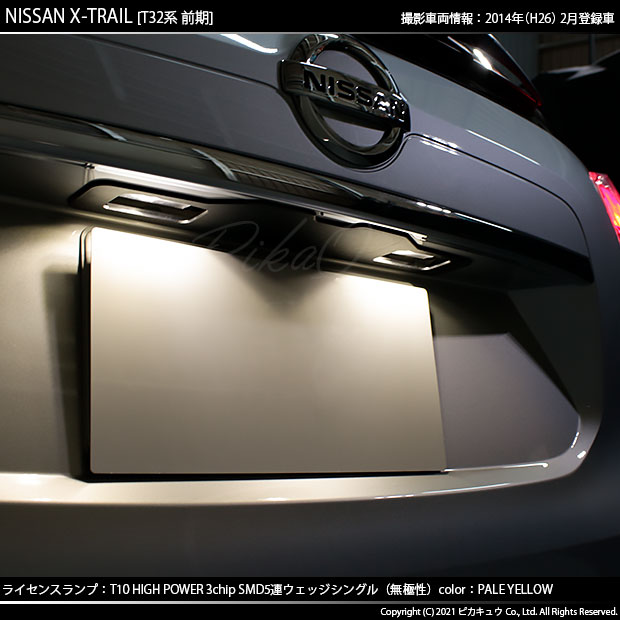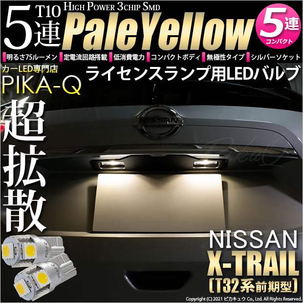ピカキュウ,LED専門店,LEDバルブ,LED,SMD,T10,W5W,T10 HIGH POWER 3CHIP SMD 5連ウェッジシングル球,ペールイエロー,ライセンスランプ,番号灯,ニッサン,NISSAN,エクストレイル,X-TRAIL,T32,T32系,前期