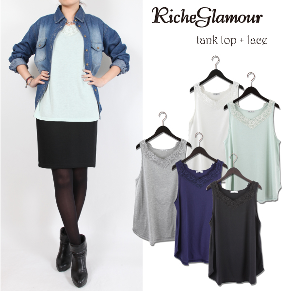 【ネコポス便:ポスト投函,日時指定不可、代引き不可 送料無料】 天竺レース付タンクトップ