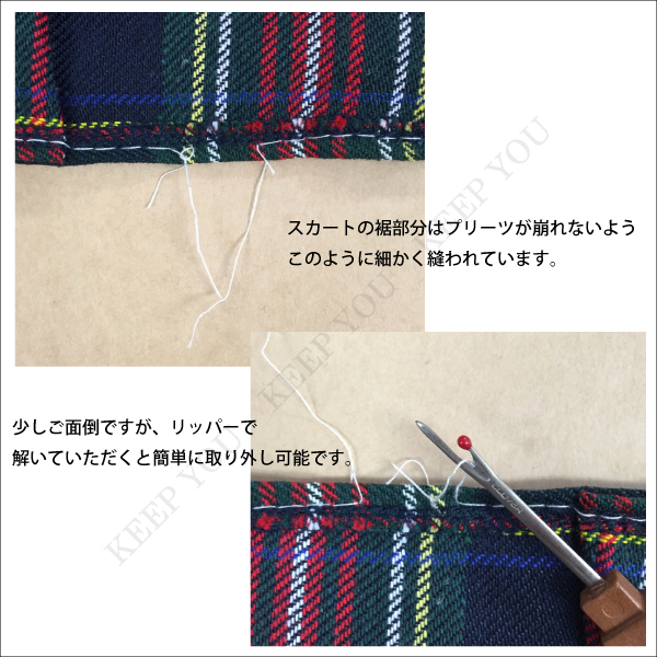 プリーツが崩れないようスカートの裾にしつけ縫いを施しております。