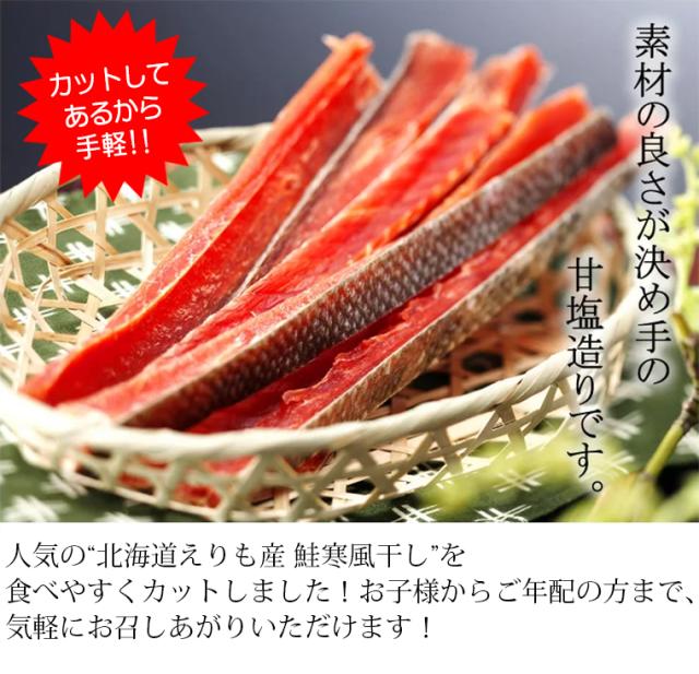 この製品は、北海道沖で獲れた鮭を寒風(11月から3月)に干して仕上げたものです。昔ながらの素朴な味を楽しめる逸品です。