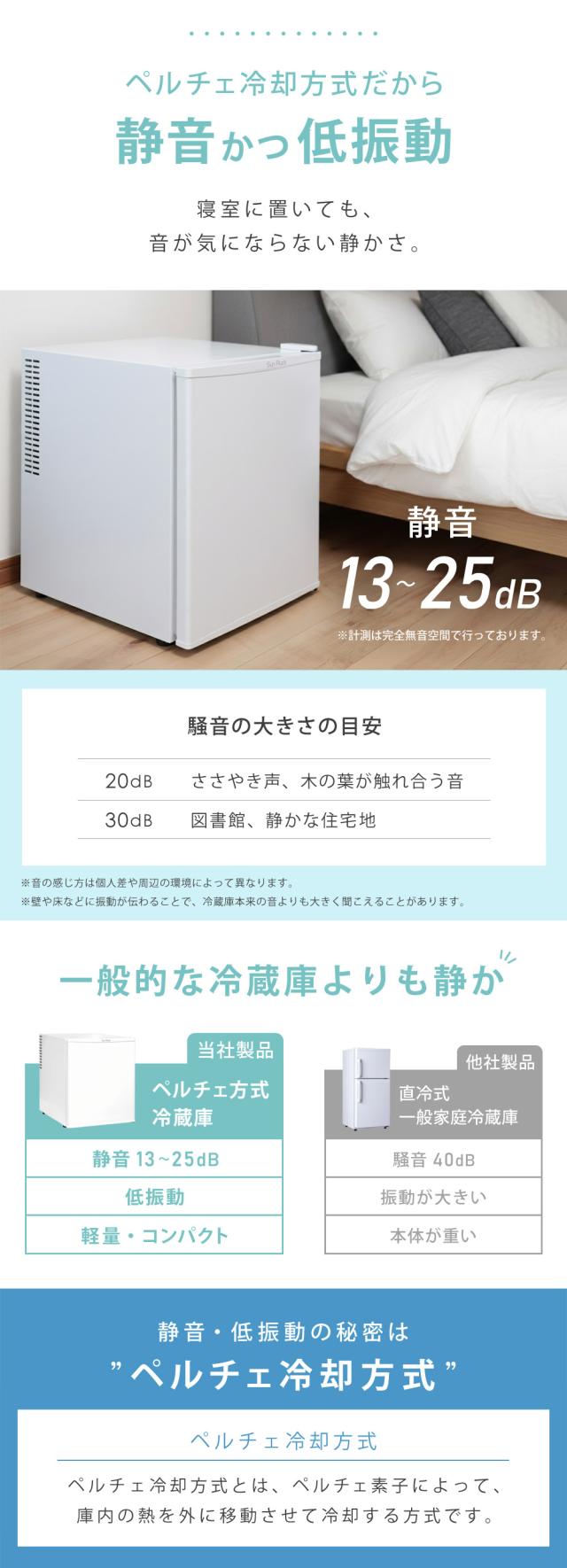 | 時短調理に欠かせない冷凍食品を保存できる小型冷凍庫は、あると便利です。 おうち時間や テレワーク 在宅ワーク リモートワーク におすすめです。 1人暮らしやジュース用の冷蔵庫としても使える1ドア冷蔵庫。 コンパクトサイズだからせまいスペースや静粛性の高い寝室など、今まで冷蔵庫が置けなかったちょっとした場所に使えます! ■ペルチェ方式 振動・騒音が少なく、寝室にもお使いいただけます。 ■温度調節機能 冷やすものによって冷蔵庫内の温度を変えられます。 ■コンパクト設計 コンパクトな本体サイズで、置き場所にも困りません。 業務用 ホテル 病院 クリニック 施設 等でもご活用いただいております。 もちろん 一人暮らし お部屋用 新生活 アイテムとしてもお勧めです。