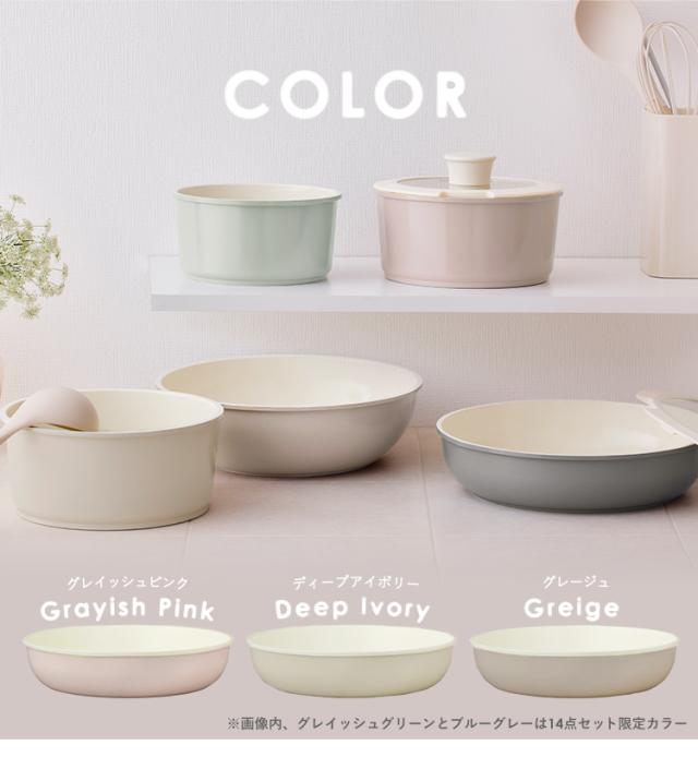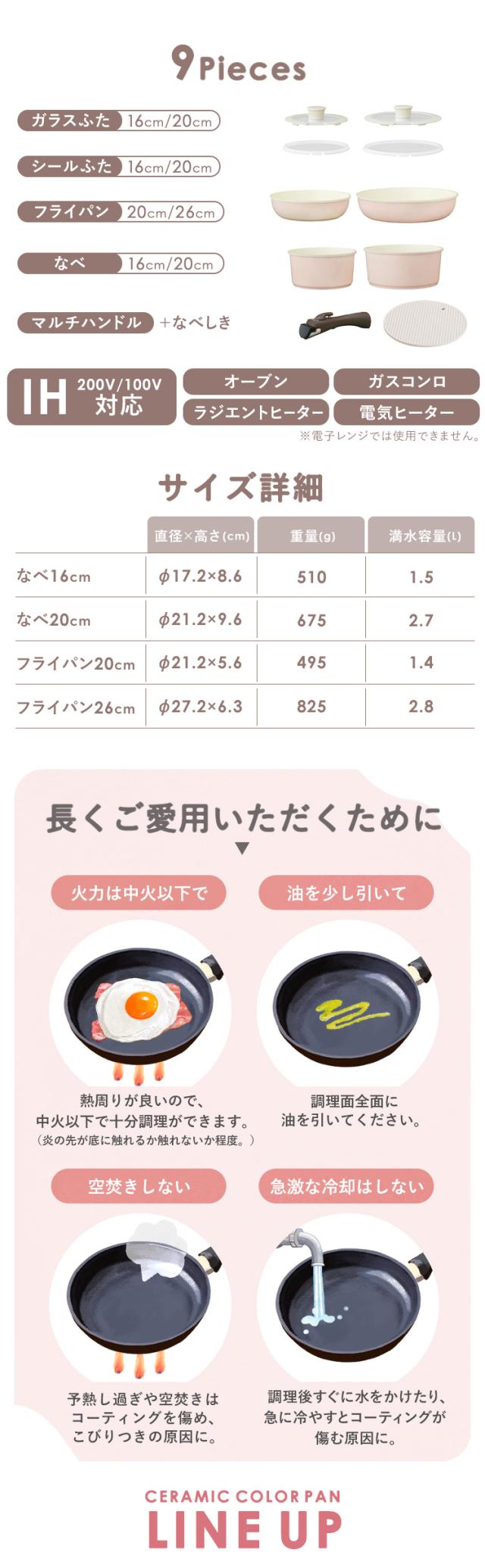 フライパン:26/20cm、なべ:20/16cm、シリコン縁ガラスふた:20/16cm、PEシールふた:20/16cm、マルチハンドル、シリコンなべ敷き17cm※カラー・形が変わる場合があります。