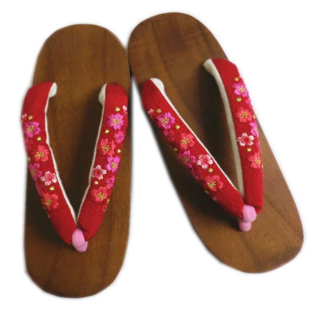 下駄 刺繍 茶桐台 赤色地桜 フリー 浴衣 ゆかた 女性用 レディース
