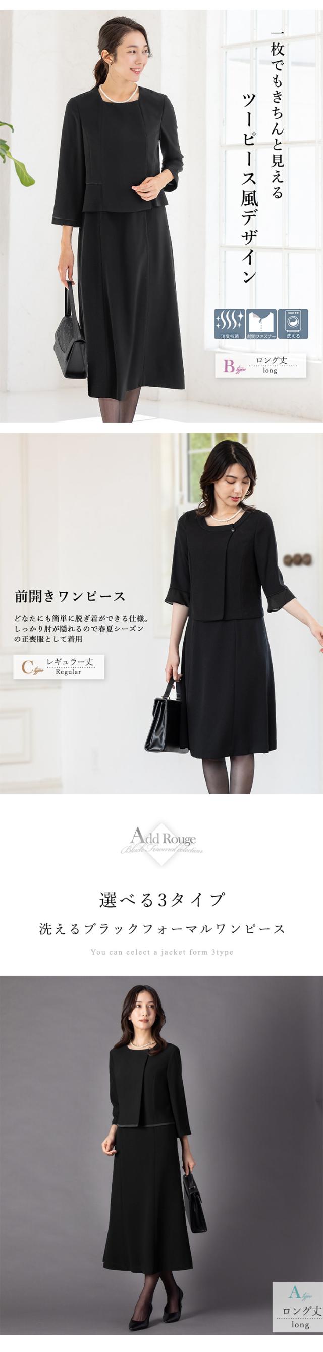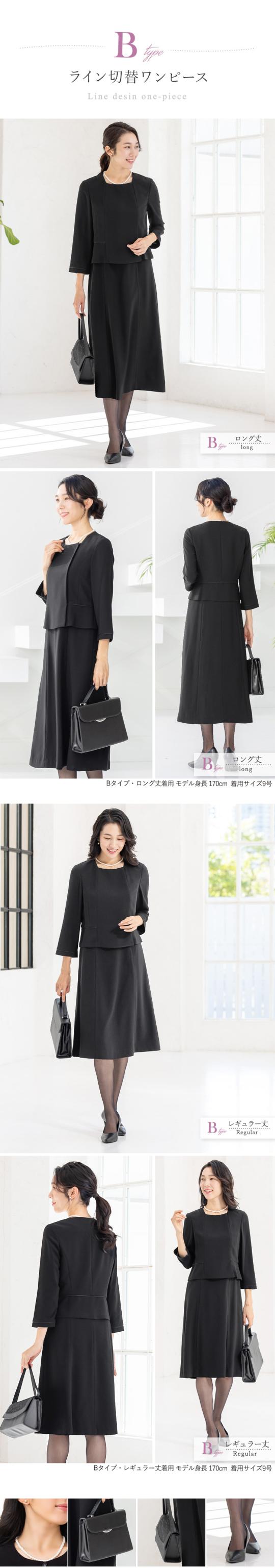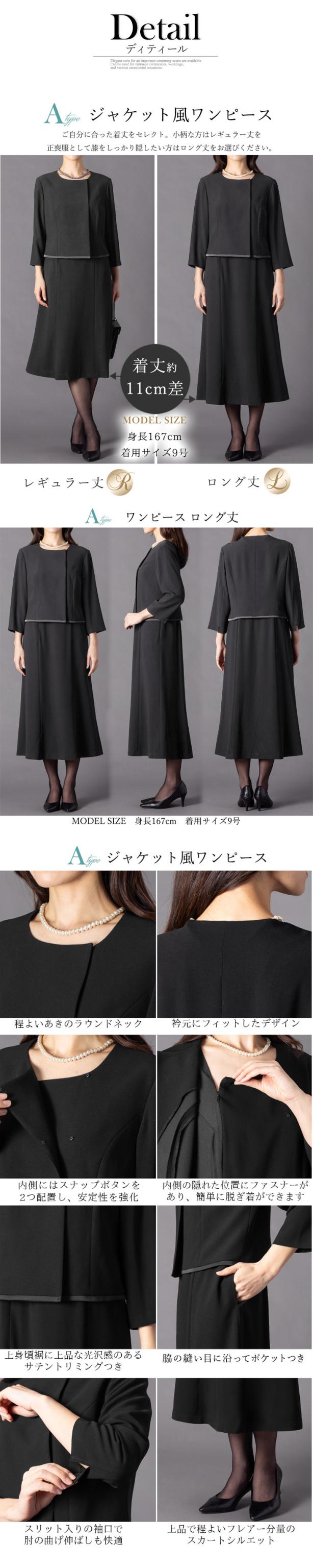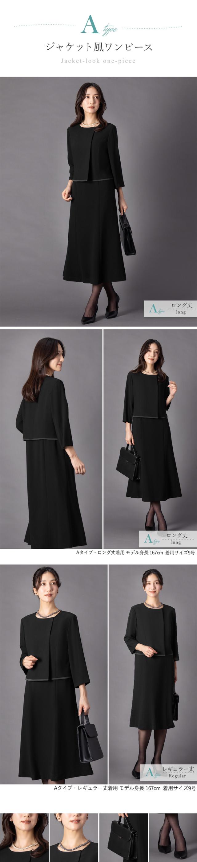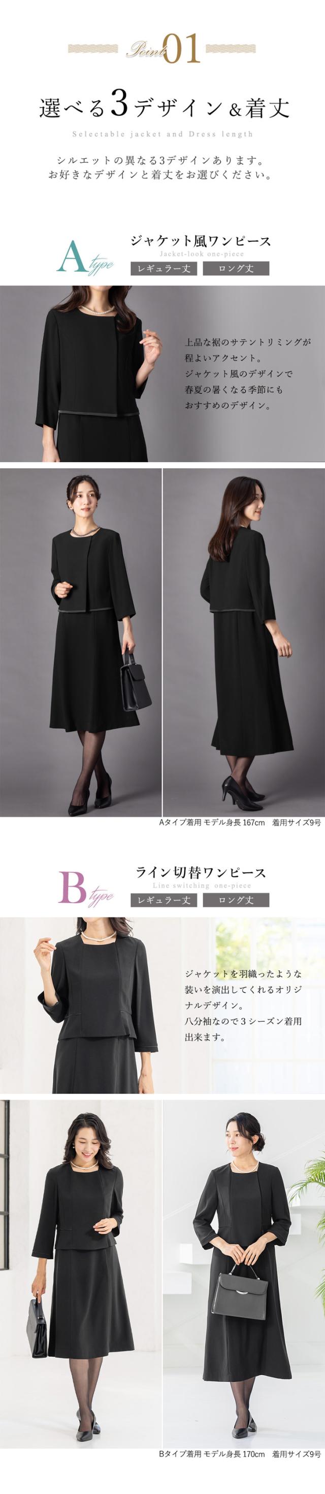 冠婚葬祭のマナーに沿った上品なブラックのデザインと着丈が選べるワンピースです。