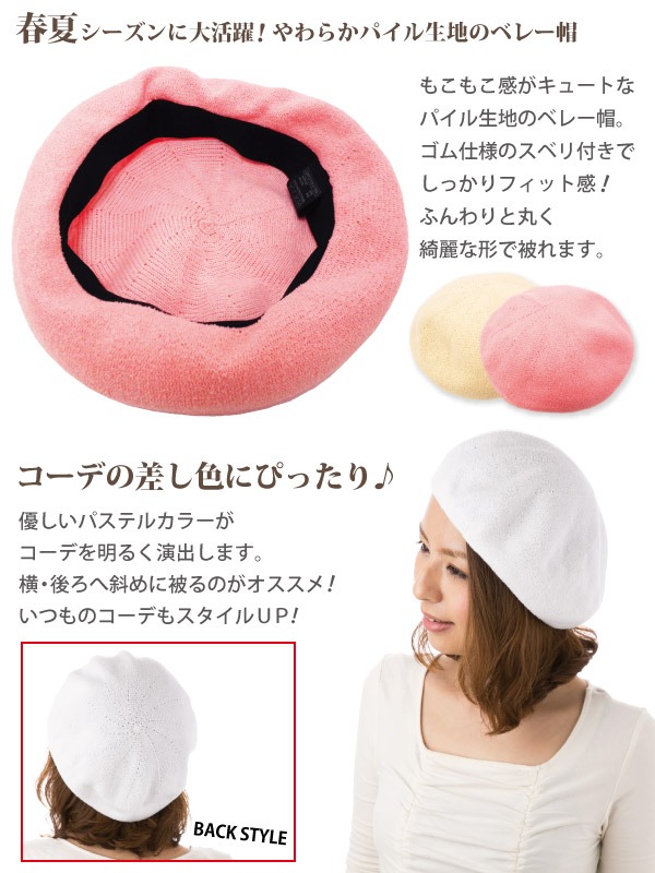 涼しい ベレー帽 やわらかパイル生地 パステル無地 hat-1168 メール便は送料無料 ベレー 帽子 春夏 UV 紫外線対策 レディース ガーリー カジュアル ペールカラー ミルキーカラー 淡い色 カラフル 差し色 薄手 メッシュ 通気性 涼しい おしゃれ