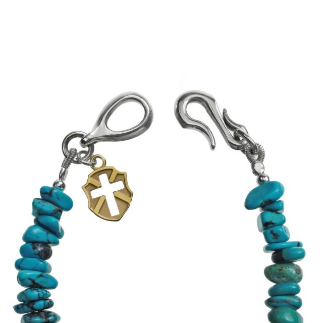 ターコイズブルーのブレスレットはコーディネートのワンポイントになってくれるインパクトのあるカラーです。そのため細めのブレスレットでも十分目立ち腕時計等との重ねづけもお勧めです!天然のターコイズを使用している為大きさやカラーが一つ一つ違います。そこがまた一層雰囲気が良くナチュラルなテイストを出しています。ジョイント部にはシルバー925素材を使用、ブランドのゴールドロゴプレートもたれ下がり高級感を演出します。