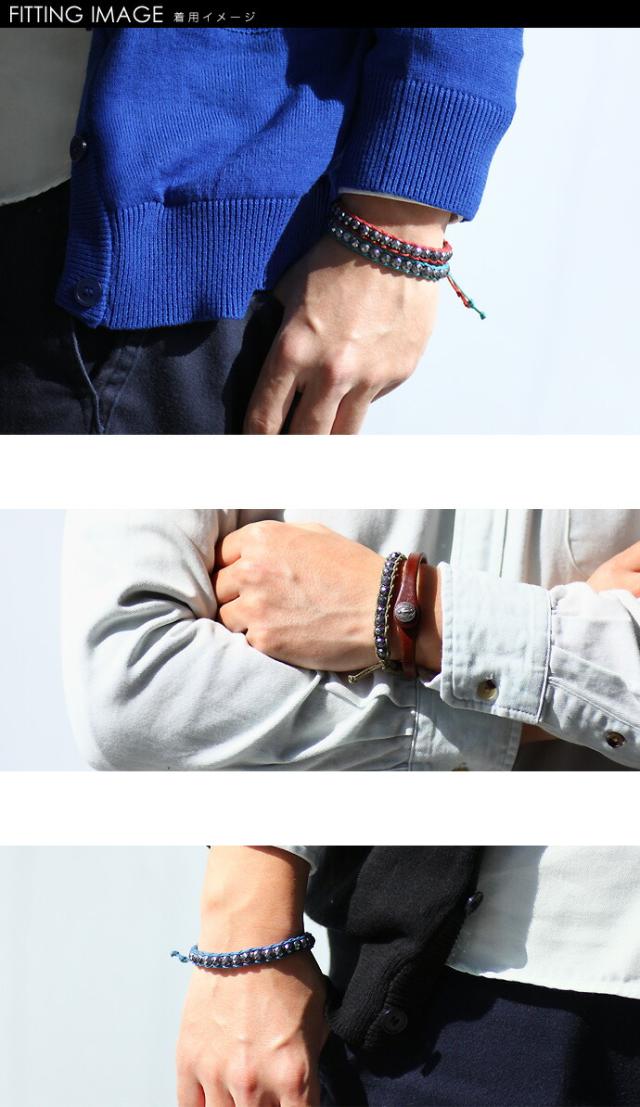 カットされたヘマタイトが男らしさを演出してくれる天然石のブレスレットです。ストーンが綿素材の紐で編み込まれしっかりとした印象です。脱着は紐を引っ張るだけと簡単な作りになっています。何色かを重ねづけしてもカッコよく決まるヘビロテ間違いなしのブレスレットに仕上がっています。