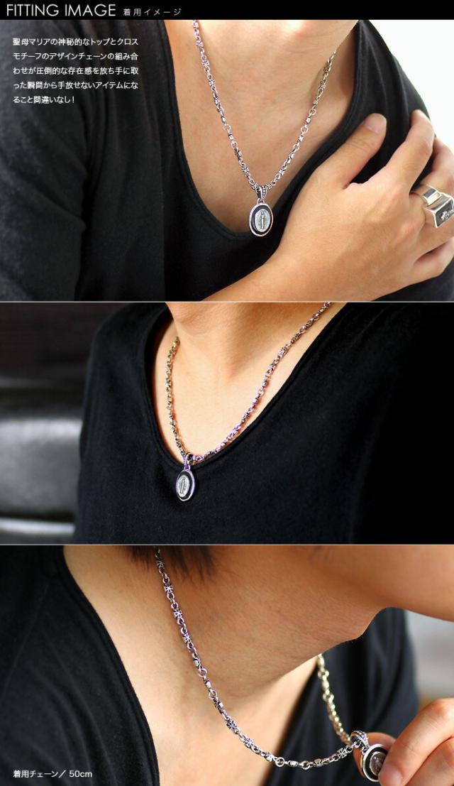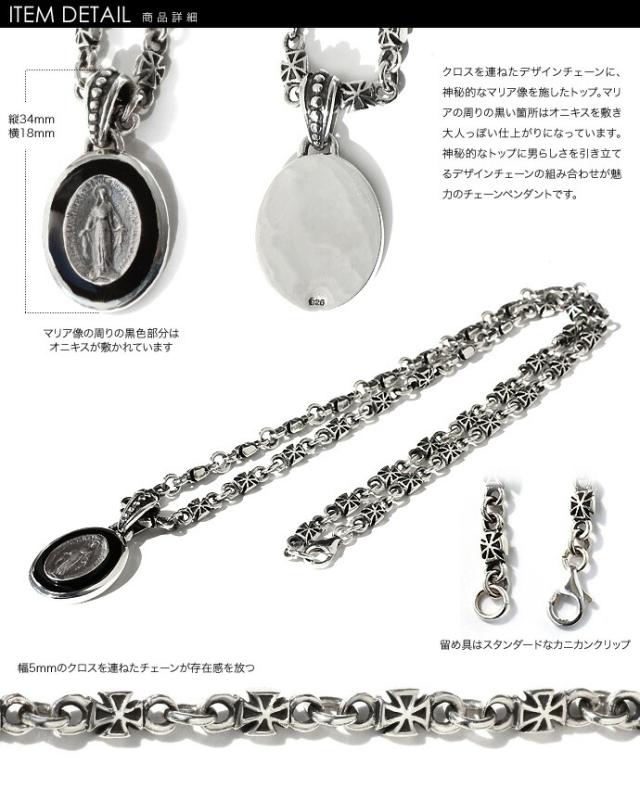 クロスを連ねたデザインチェーンに、神秘的なマリア像を施したトップ。マリアの周りの黒い箇所はオニキスを敷き大人っぽい仕上がりになっています。神秘的なトップに男らしさを引き立てるデザインチェーンの組み合わせが魅力のチェーンペンダントです。