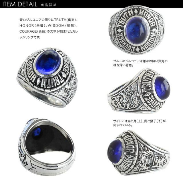青いジルコニアの周りにTRUTH(真実)、HONOR(栄誉)、WISDOM(智慧)、COURAGE(勇敢)の文字が刻まれたカレッジリングです。