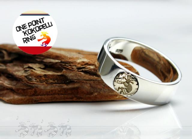インディアンジュエリーのモチーフとして使われる、発芽と豊穣を体現している精霊ココペリをワンポイント(真鍮製)に使用したシルバーリング。シンプルながらも、リングのなめらかな光沢は高級感が溢れ、美しいの一言です。