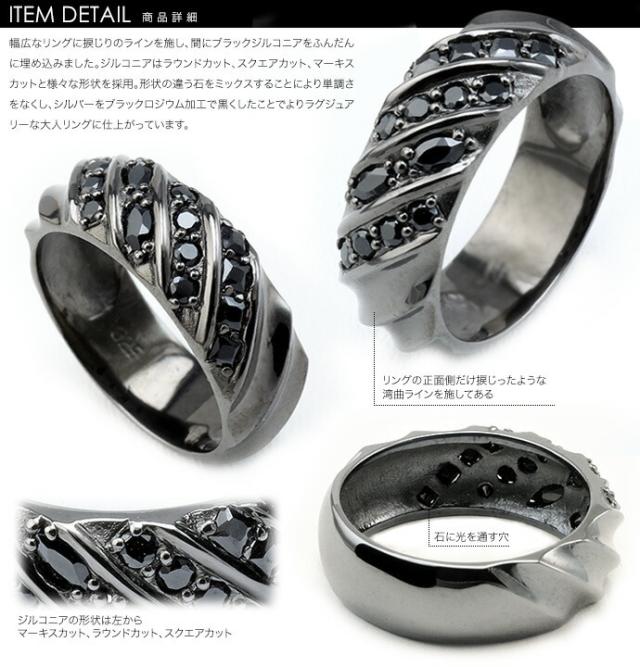 幅広なリングにねじりのラインを施し、間にブラックジルコニアをふんだんに埋め込みました。ジルコニアはラウンドカット、スクエアカット、マーキスカットと様々な形状を採用。形状の違う石をミックスすることにより単調さをなくし、シルバーをブラックロジウム加工で黒くしたことでよりラグジュアリーな大人リングに仕上がっています。