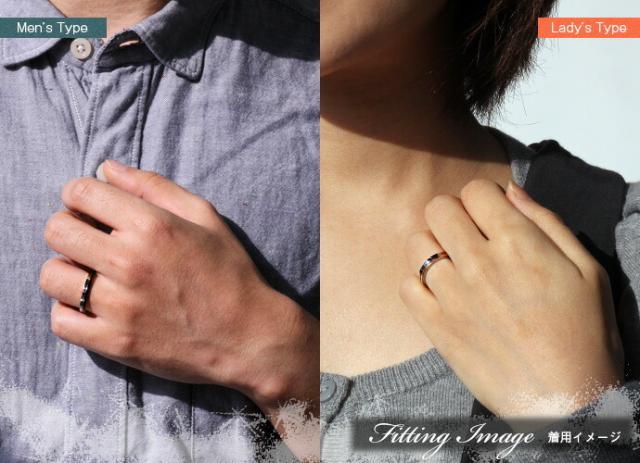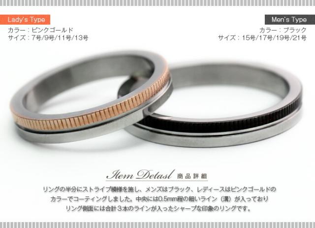 | 説明 | リングの半分にストライプ模様を施し、メンズはブラック、レディースはピンクゴールドのカラーでコーティングしました。中央には0.5mm程の細いライン(溝)が入っておりリング側面には合計3本のラインが入ったシャープな印象のリングです。 |