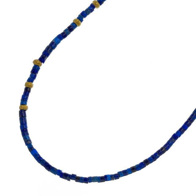 円柱型のビーズにカットしたラピスラズリとゴールドカラーの真鍮ビーズを散りばめたブレスレット。鮮やかブルーのラピスラズリが腕元を華やかにしてくれますよ。