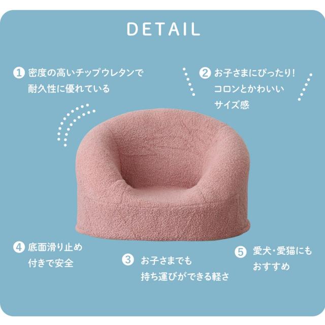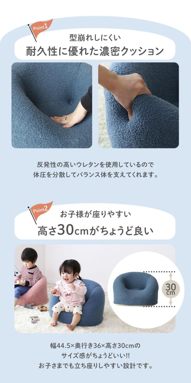 まるっこいフォルムがかわいい子ども用ソファ。幅44.5×奥行36×高さ30cmのコンパクト設計で、お子様一人にちょうどいいサイズ感です。軽量で持ち運びやすく、リビングや子ども部屋など好きな場所で使えます。クッション性もしっかりしており、安心して長く使える一台です。