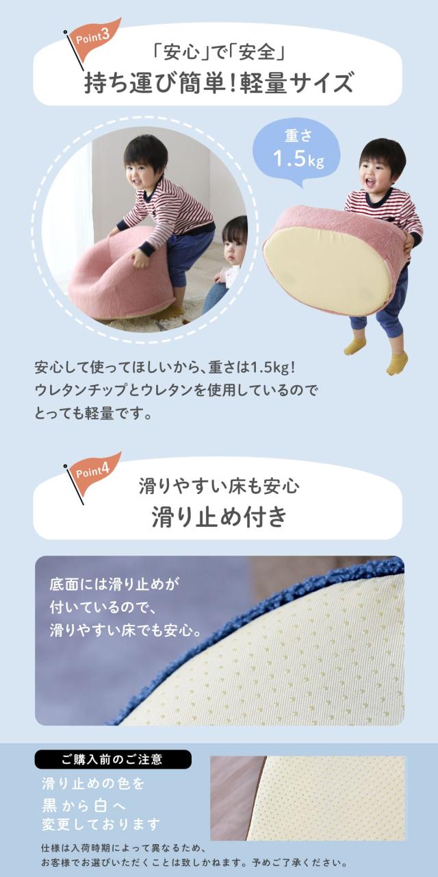 中材にはウレタンフォームを使用し、型崩れしにくい設計。適度な硬さの座面が安定した姿勢を支え、毎日使っても快適さが続きます。軽量で扱いやすく、裏面には滑り止め加工を施すなど、安全性にも配慮したキッズソファです。