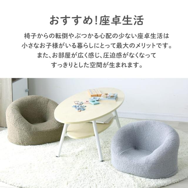小さなお子様やペットのいるご家庭では、転倒などアクシデントの観点からも「座卓生活」がおすすめです。このキッズソファは高さ約30cmと低めの設計なので、座卓やローテーブルとの相性も抜群。椅子に座るのが苦手なお子様にも、やわらかいクッションとフィット感のあるフォルムが安心感を与え、自発的に“座る習慣”が身につくきっかけにもなります。高さが低いことで万が一転倒してもリスクが少なく、ペットのくつろぎスペースとしても活躍。座卓やミニテーブルと組み合わせて使えば、子ども部屋やリビングでもスッキリとした印象に。