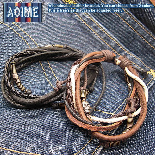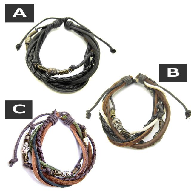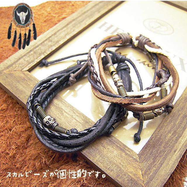 ブレスレット レザー 革 ブレス フリーサイズ スカル ドクロ 髑髏 ビーズ レザー コットン 手作り 男女兼用 3-5751