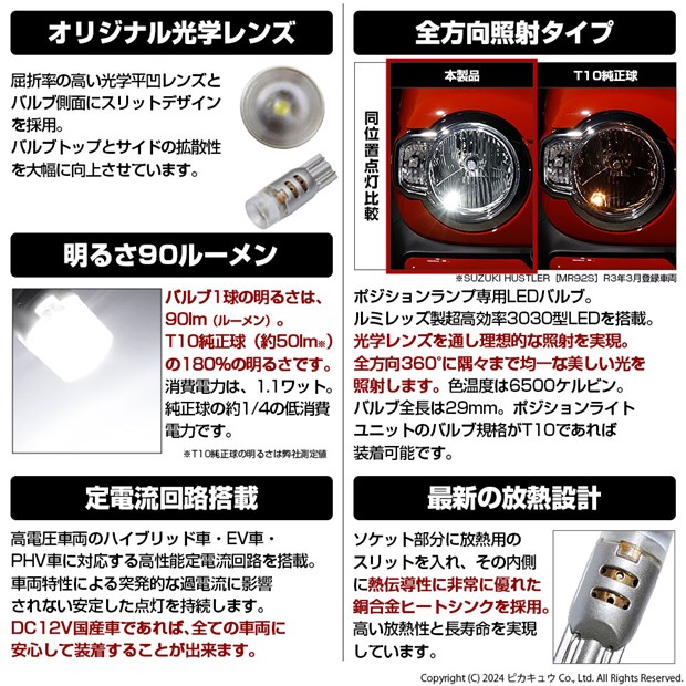 オリジナル光学レンズ 屈折率の高い光学平凹レンズとバルブ側面にスリットデザインを採用。バルブトップとサイドの拡散性を大幅に向上させています。 明るさ90ルーメン バルブ1球の明るさは90lm(ルーメン)。T10純正球(約50lm※)の180%の明るさです。 消費電力は、1.1ワット。純正球の約1/4の低消費電力です。 ※T10純正球の明るさは弊社測定値 定電流回路搭載 高電圧車両のハイブリッド車・EV車・PHV車に対応する高性能定電流回路を搭載。車両特性による突発的な過電流に影響されない安定した点灯を持続します。DC12V国産車であれば、すべての車両に安心して装着することが出来ます。 全方向照射タイプ ポジションランプ専用LEDバルブ。高輝度・超高拡散 3030型 POWER LEDを搭載。光学レンズを投資理想的な照射を実現。全方向360°に隅々まで均一な美しい光を照射します。色温度は6500ケルビン。バルブ全長は29mm。ポジションライトユニットのバルブ規格がT10であれば装着可能です。 最新の放熱設計 ソケット部分に放熱用のスリットを入れ、その内側に熱伝導性に非常に優れた銅合金ヒートシンクを採用。高い放熱性と長寿命を実現しています。 無極性 シルバー塗装ソケットを採用し昼間の明るい時でもソケットが目立たず違和感なく収まります。 |