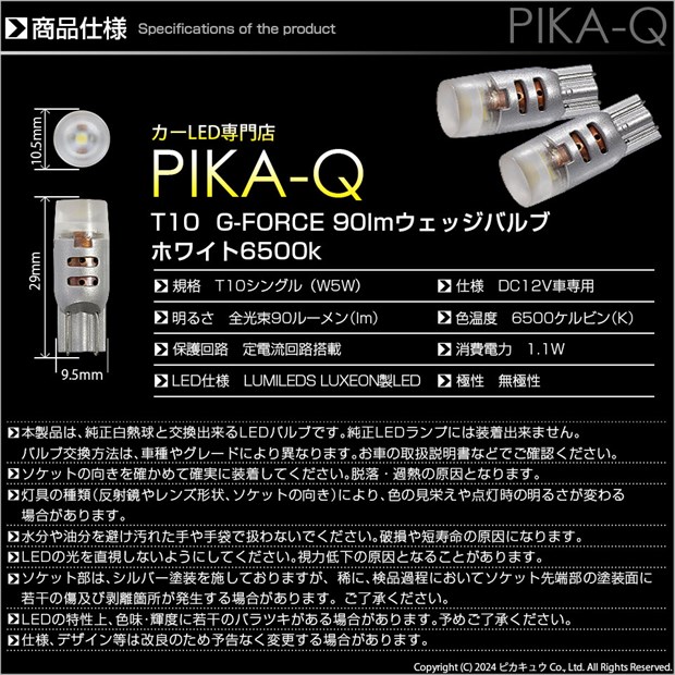 | サイズ | 全長:29mm/最大直径:10.5mm/幅:9.5mm ※純正T10白熱球サイズ 全長:27mm/最大直径:10mm/幅:9.5mm |