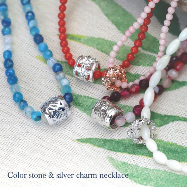 ハワイアンジュエリー ネックレス 天然石 レディース メンズ ハウライトターコイズ 水晶 パール ピンク サンゴ 珊瑚 レッドアゲート サファイアアゲート シルバー925 チャーム アジャスター ホワイトデー 卒業式 入学式 【品番:SN-002】