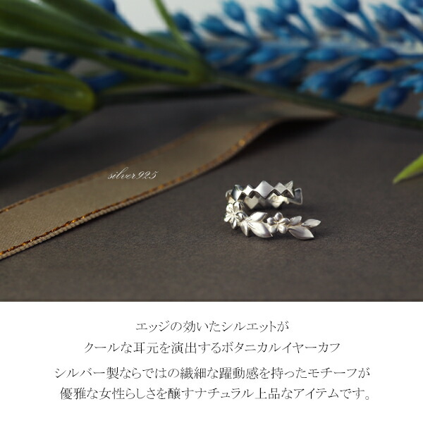 リーフ フラワー シルバー イヤーカフ 1P 片耳用 シルバー925 蔦 花 ニチニチソウ 植物 ボタニカル ナチュラル 自然 南国 花冠 ダイヤ