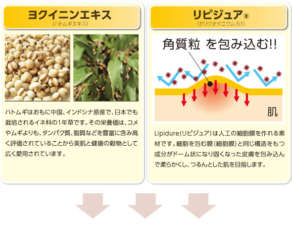 【成分】水,エタノール,(ジメチコン/ビニルジメチコン)クロスポリマー,ヨクイニンエキス,グリチルリチン酸ジカリウム,ポリクオタニウムー51,グリセリン,アルギニン,カラメル,オウゴンエキス,エイジツエキス,カルボマー,(C12-14)パレス-12,エチルパラベン,プロピルパラベン,メチルパラベン,BG
