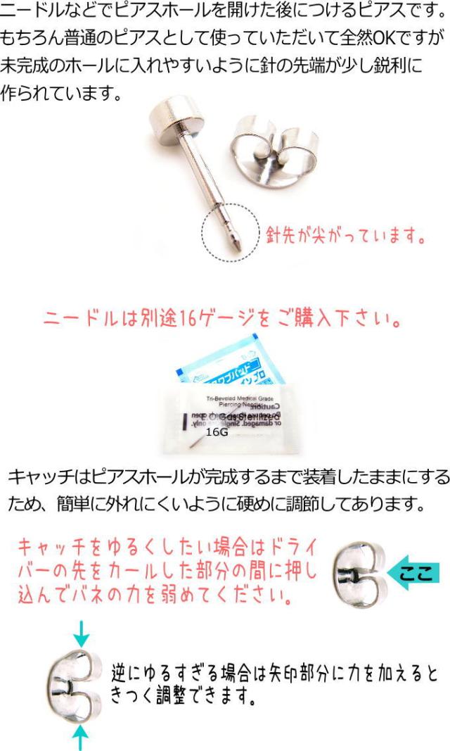 医療用ステンレス製なのでトラブルが起こりにくく、未完成のホールにも入れやすいように、針の先端が少し鋭利に作られています。