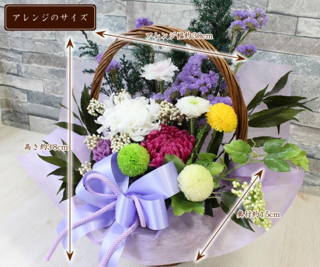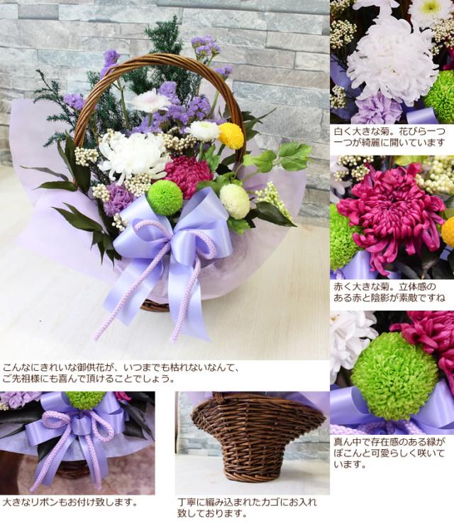 ■花材:大輪菊1輪、中輪菊1輪、ことね菊、小菊、大輪糸菊白1輪、スプレーカーネーション紫1輪、ポンポン菊1輪、グリーンオーナメント、葉、スターチース、白い実、クラスペディア