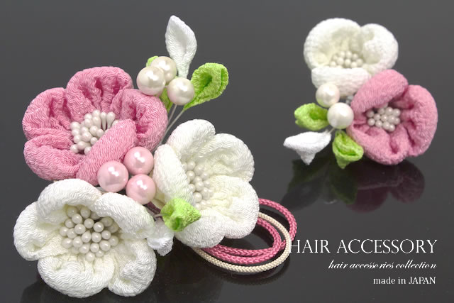ぷっくりとした縮緬の花が可愛らしいデザインです。添えられた水引やパールの装飾が優しくて可憐な印象を与えます。