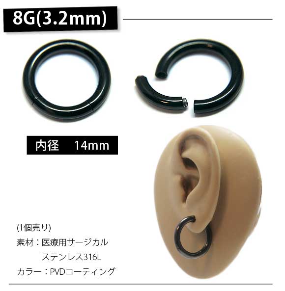 本日P2倍 8G ピアス ボディピアス フープ セグメントリング 黒 ブラック リング 拡張 金属アレルギー対応 316L 高品質 ステンレス