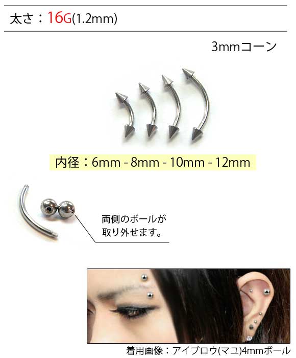 本日P2倍 ▲16G ピアス ボディピアス カーブドバーベル バナナバーベル コーン 金属アレルギー対応 316L 高品質 ステンレス 軟骨 眉 マディソン