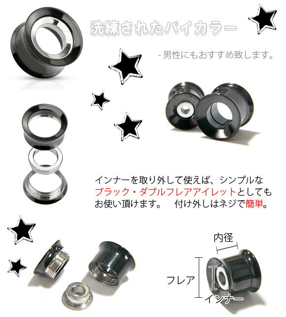 本日P2倍 00G ボディピアス 2Way ダブルフレア アイレット バイカラープラグ 金属アレルギー対応 316L 高品質 ステンレス 拡張 プラグ