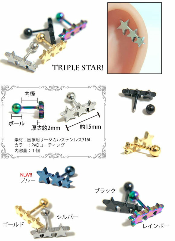 本日P2倍 16G ボディピアス トリプルスターストレートバーベル 星 金属アレルギー対応 316L 高品質 ステンレス 軟骨ピアス