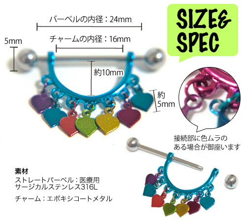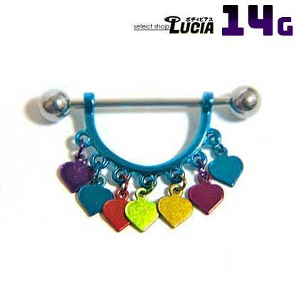本日P2倍 14G ピアス ボディピアス ぶらさがりレインボーハートシールドのストレートバーベル 金属アレルギー対応