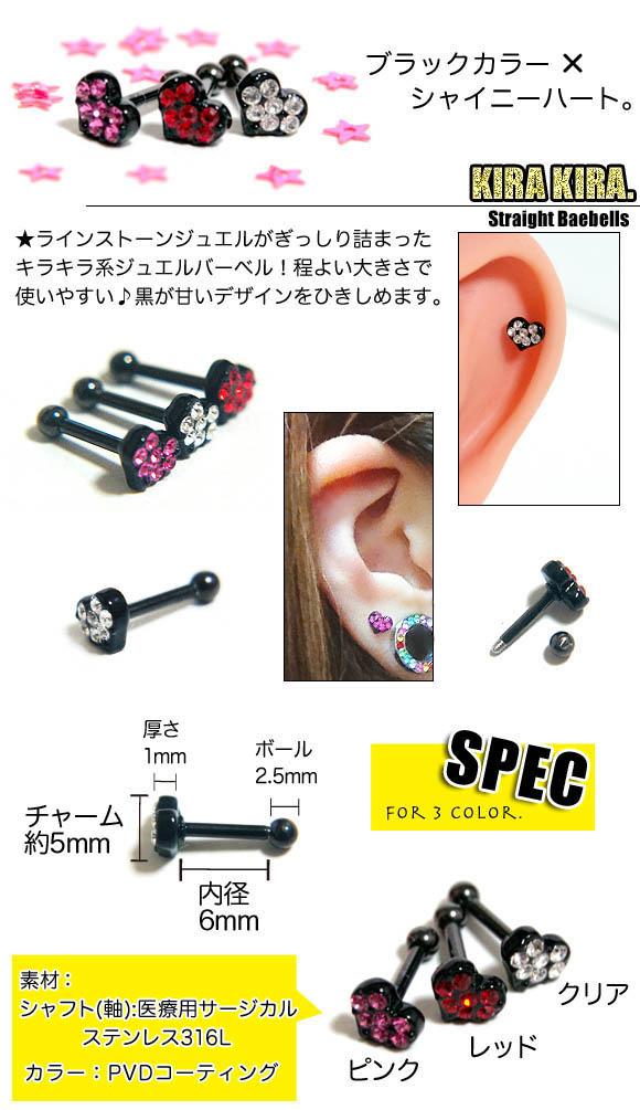 本日P2倍 16G ピアス ボディピアス ストレートバーベル 黒 キラキラ ハート 金属アレルギー対応 316L 高品質 ステンレス 軟骨ピアス