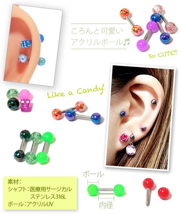 本日P2倍 内径が選べる 16G ピアス ボディピアス ストレートバーベル キャンディ アクリルボール 軟骨ピアス 金属アレルギー対応 316L 高品質 ステンレス