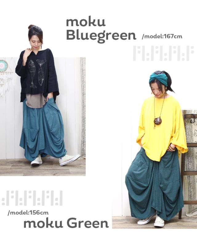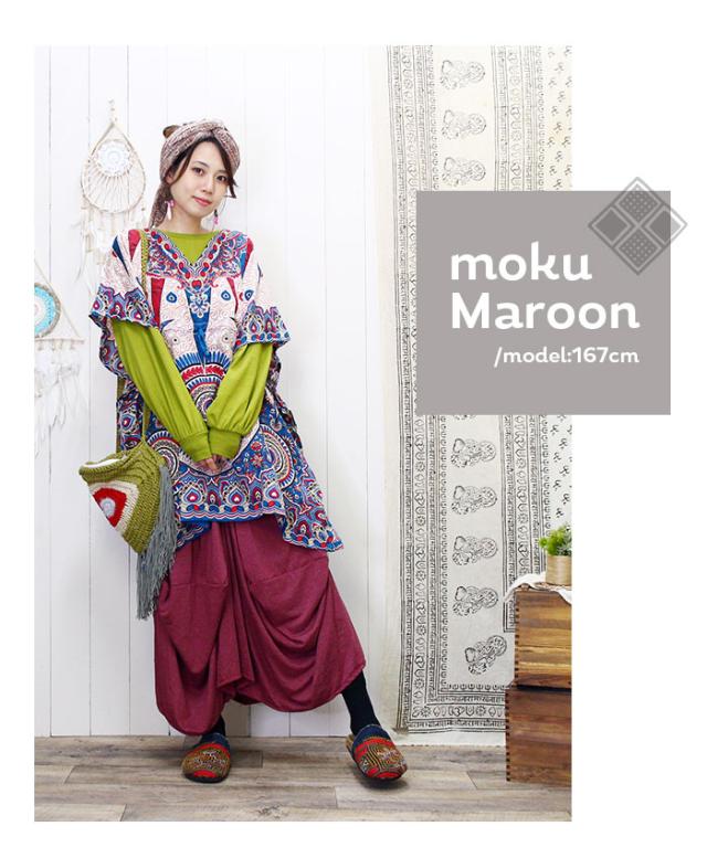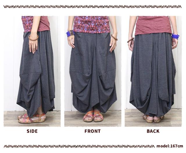 パンツのようにも見えるユニークデザインの変形ロングスカート。