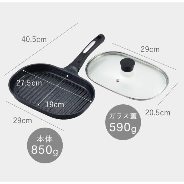 ■材質:本体/アルミニウム合金(フッ素樹脂塗膜加工)、鉄(溶射加工)、ガラス蓋/強化ガラス(全面物理強化)、ハンドル・つまみ/フェノール樹脂