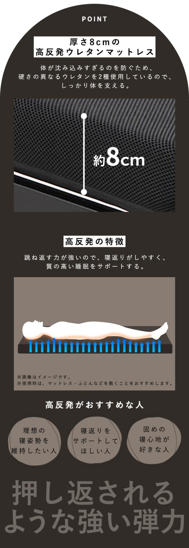 厚さ約8cm、跳ね返す力が強く寝返りがしやすい高反発ウレタンマットレス。