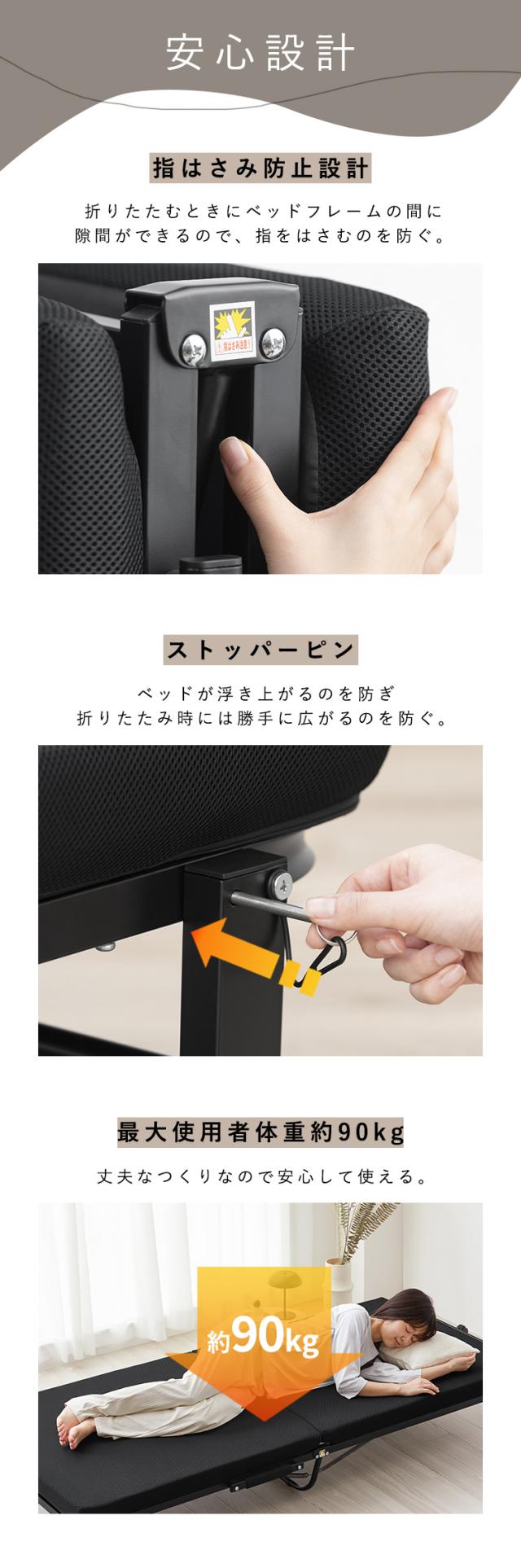 ・指はさみ防止設計:折りたたむ時、ベッドフレームの間に隙間ができるから、指をはさむのを防ぐ。