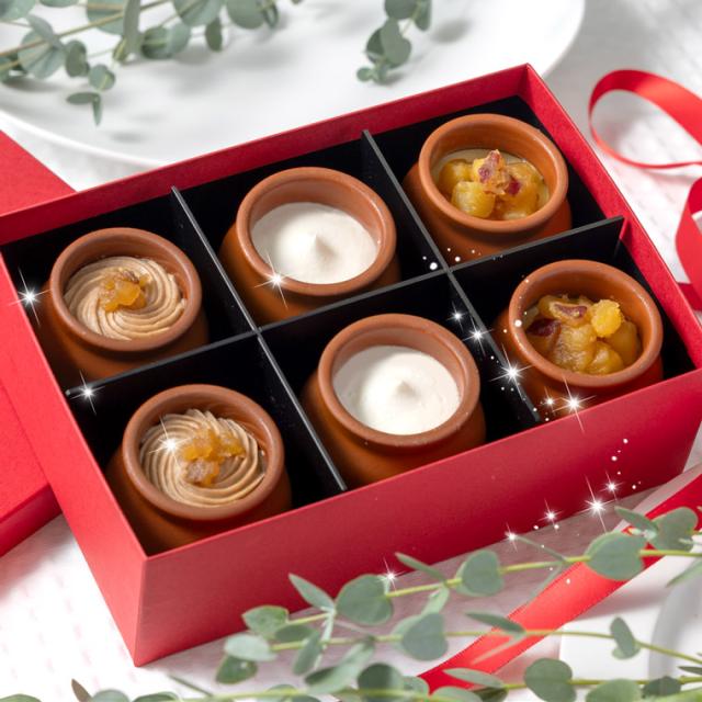 可愛い素焼きの壷に入ったとろとろプリンは、まさにすくって食べるような魔法の食感!モンドセレクションで最高金賞受賞のとろける濃厚カスタード、蜜漬けのお芋をトッピングしたとろ〜りなめらかなお芋、栗の贅沢な味わいがつまったマロンの壷プリンが集まった数量限定スイーツギフト!