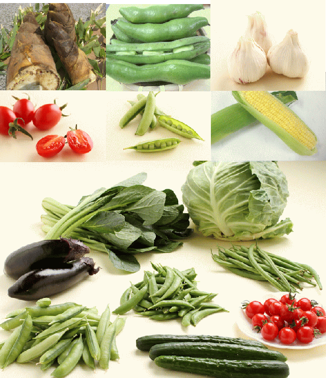 | 【春】 ごぼう・小松菜・キャベツ・ふき・チンゲン菜・南京・なすび・ミニトマト・トマト・とうもろこし・いんげん・絹さや・うすい豆・そら豆・にんにく・たまねぎ・たけのこ | 【夏】 人参・ごぼう・キャベツ・南京・なすび・ピーマン・ししとう・ゴーヤ・おくら・枝豆・たまねぎ・きゅうり ・トマト・みょうが・白うり・ねぎ・エリンギ・椎茸 |