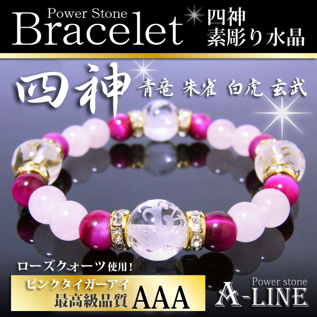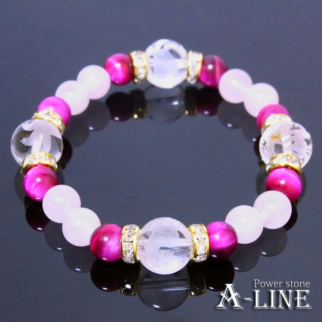 パワーストーン ブレスレット レディース 四神素彫り水晶12mm&ピンクタイガーアイ&ローズクォーツ8mm PW-2712