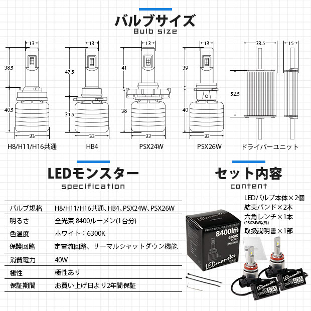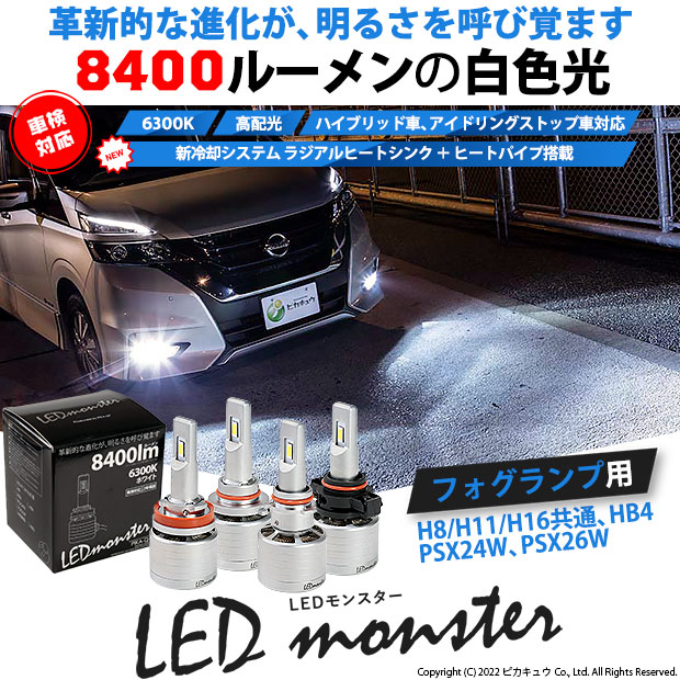 単 LED MONSTER L8400 フォグランプキット 8400lm ホワイト 6300K H8/H11/H16共通 HB4 PSX24W PSX26W